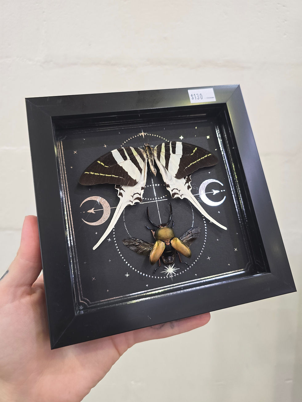 Vintage frame white lipped pit Viper & Madagascar Emperor Moth + Preserved Flowe